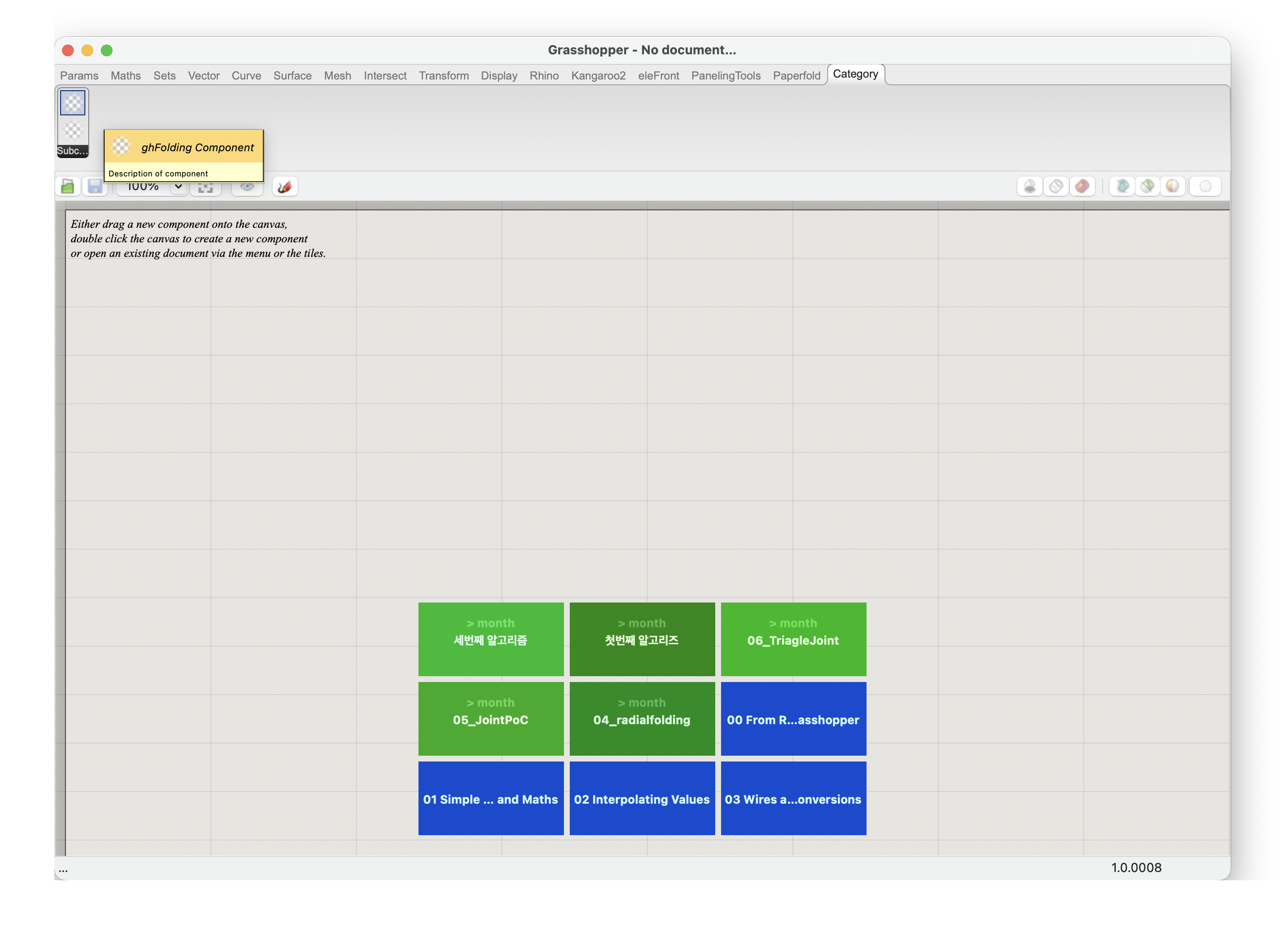 위 과정을 거치고 나면 보이는 그림과 비슷하게 코드들이 알아서 설정된 것을 확인할 수 있습니다. 그러면 그 후 좌측의 빌드 화살표버튼(화살표 + 벌레모양)을 누르면 grasshopper가 켜지고 컴포넌트가 생기는 것을 볼 수 있습니다.