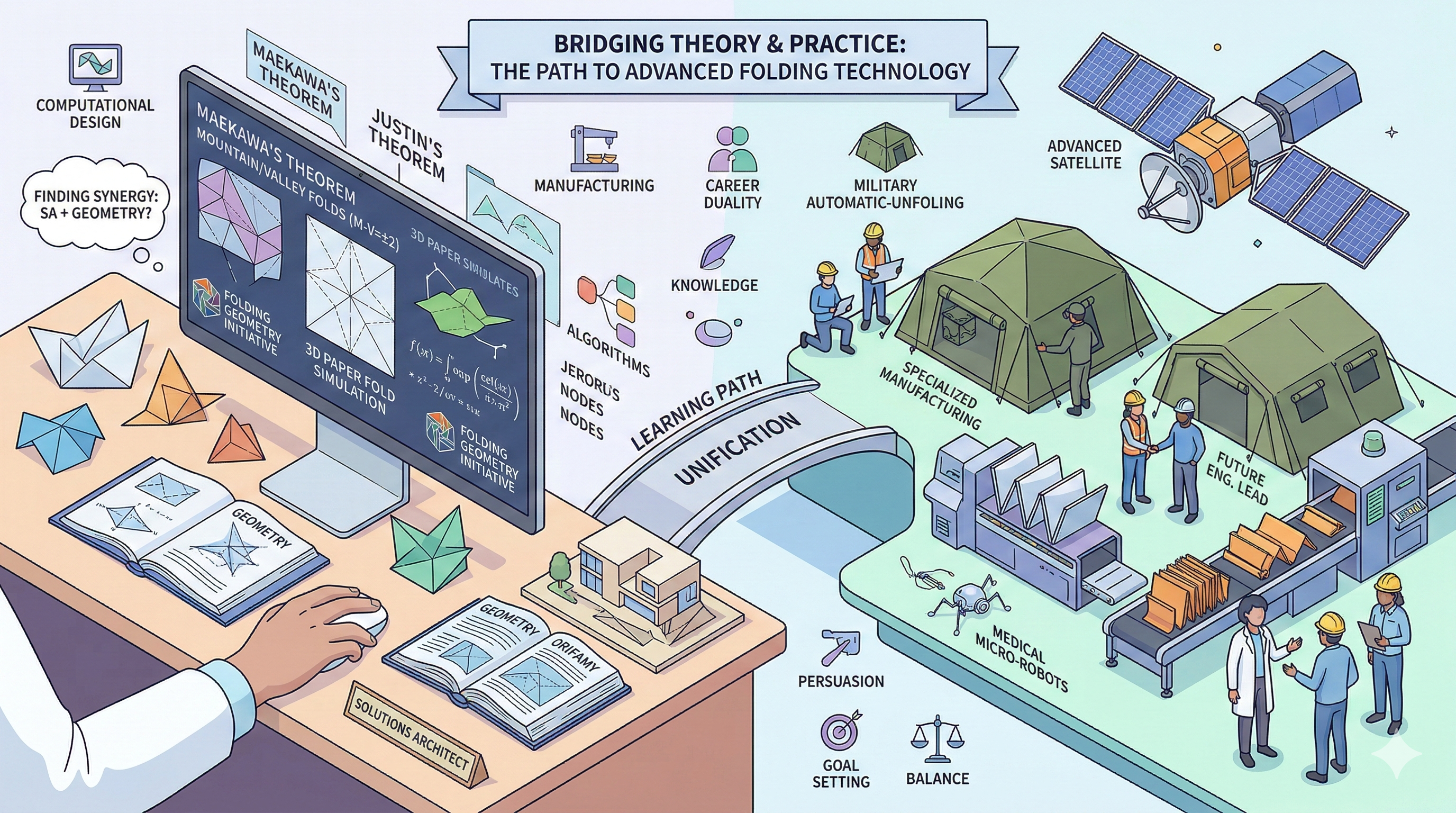 먹고사는 일과 내가 추구하는 방향이 분리될 때는 나름의 장단점이 있습니다. 현재 Solution Architect로서 하는 일 — 큰 그림을 설계하고, 사람들을 설득하는 방법을 배우는 것 — 과, 지금 공부하는 접기 이론이 쌓아가는 기술적 깊이는 분명히 다른 영역입니다.