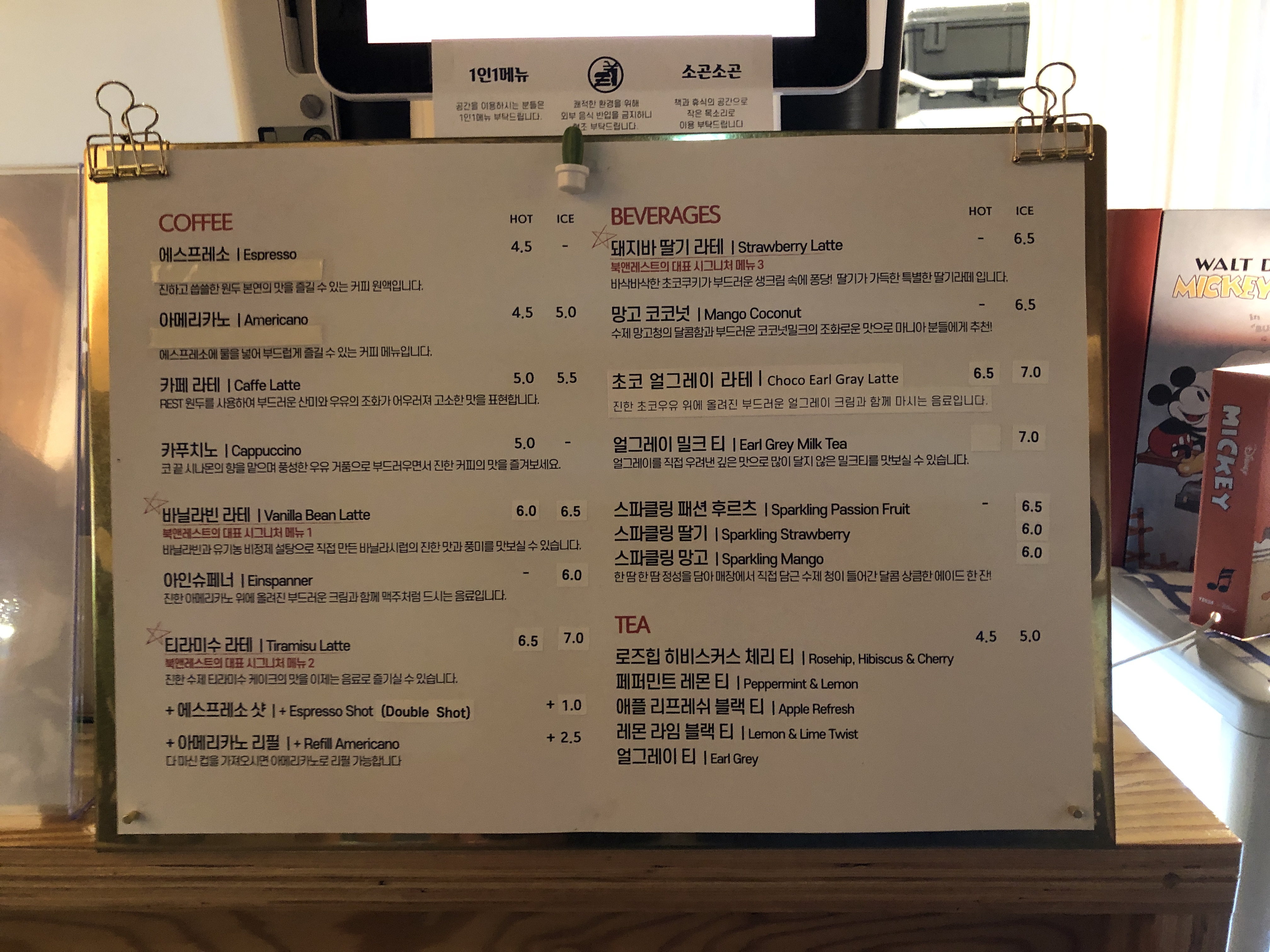 4500~7000원 까지 다양함. 와플을 판다. 시그니쳐 메뉴들이 있다.