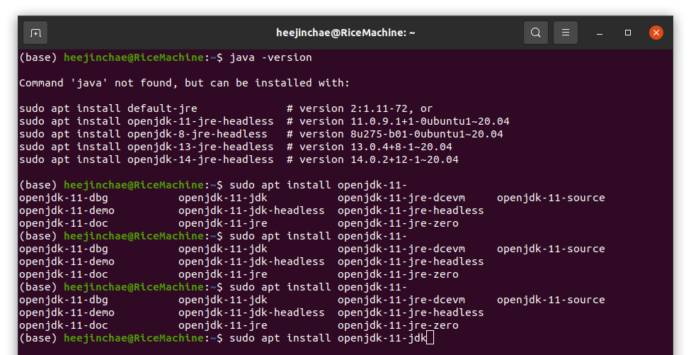 위에서 볼 수 있듯, 우분투에 자바가 설치되어 있지 않아 없다고 뜬다. 친절하게도 자바를 설치하는 여러가지 방법을 알려준다. 나는 11버전을 설치하기로 했다. 왜냐하면 역시나 Spark 문서에서 11을 지원한다고 써있었기 때문이다. 그리고 약간의 팁이라면 터미널에서 tab키를 사용하면 정말 유용하다. 본인이 원하는 내용의 앞을 대략적으로 쓰고 tab을 누르면 뒤는 자동완성해주기 떄문에 오타를 칠 위험도 줄어든다. tab을 잘 쓰자.