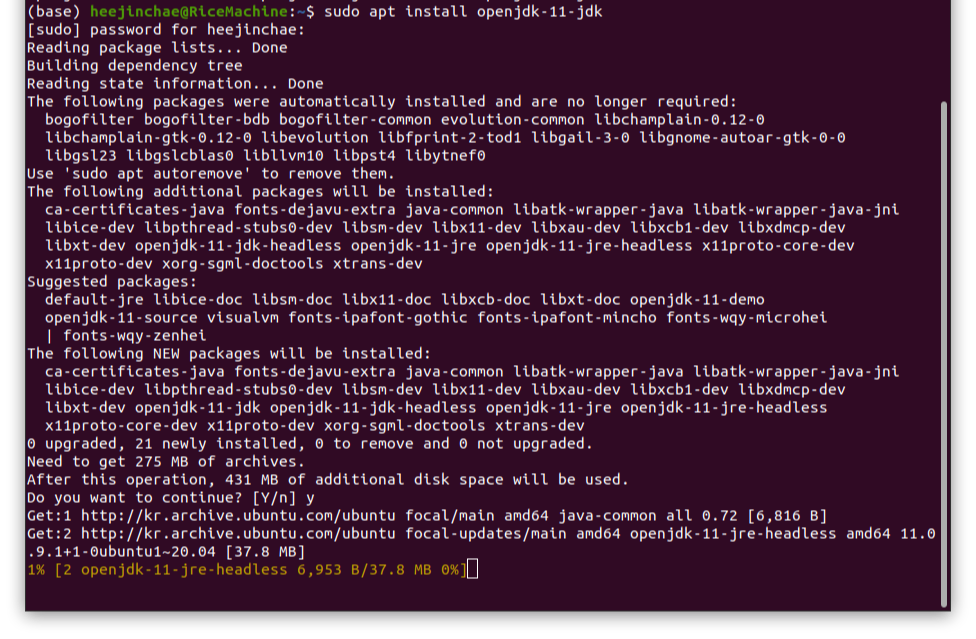 위의 코드를 통해 자바를 설치할 수 있다. 거의 자동으로 되기 때문에 큰 설명없이 그림만 첨부해야겠다.