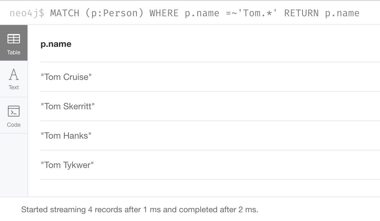 마지막의 RETURN절에선 이미 WHERE 절을 통해 원하는 노드들이 Queyr되었기 때문에 그중에서 필요한 Property만 RETURN하도록 한것을 볼 수 있다. Neo4j를 사용하면서 보니, 위와 같이 node.property식으로 질의문을 쓰게 되면 노드자체는 RETURN 되지 않고 SQL처럼 해당하는 Property만 RETURN 된다. 시각적으로 노드를 보고 싶다면 점(.)뒤의 부분을 생략하면 된다.