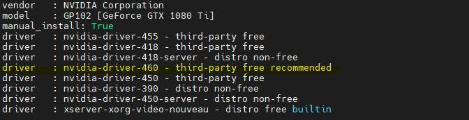 위와 같이 여러가지 드라이버를 사용할 수 있다. 다른 명령어를 통해 자동으로 설치하게 할 수도 있지만 왠지 불안하니 나는 드라이버를 확인하고 추천드라이버를 설치하기로 했다.