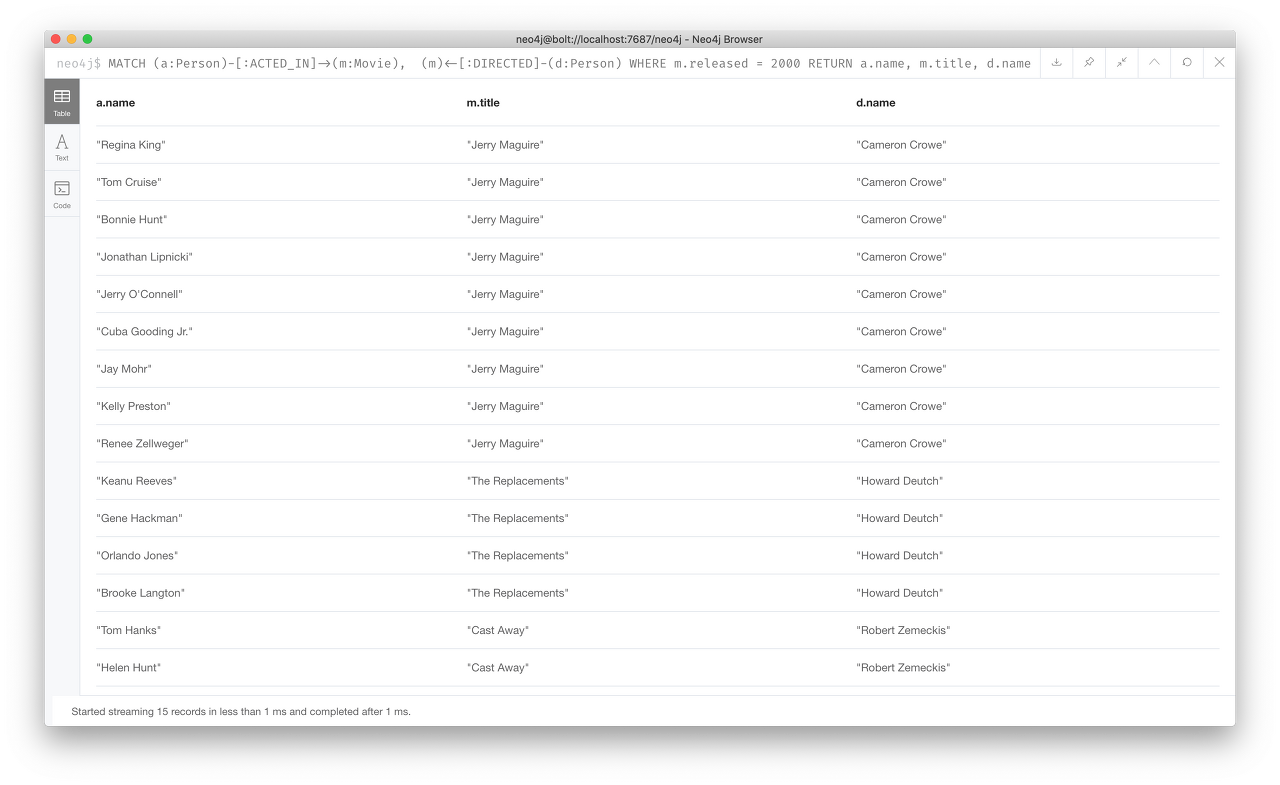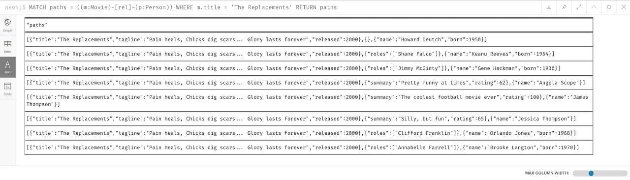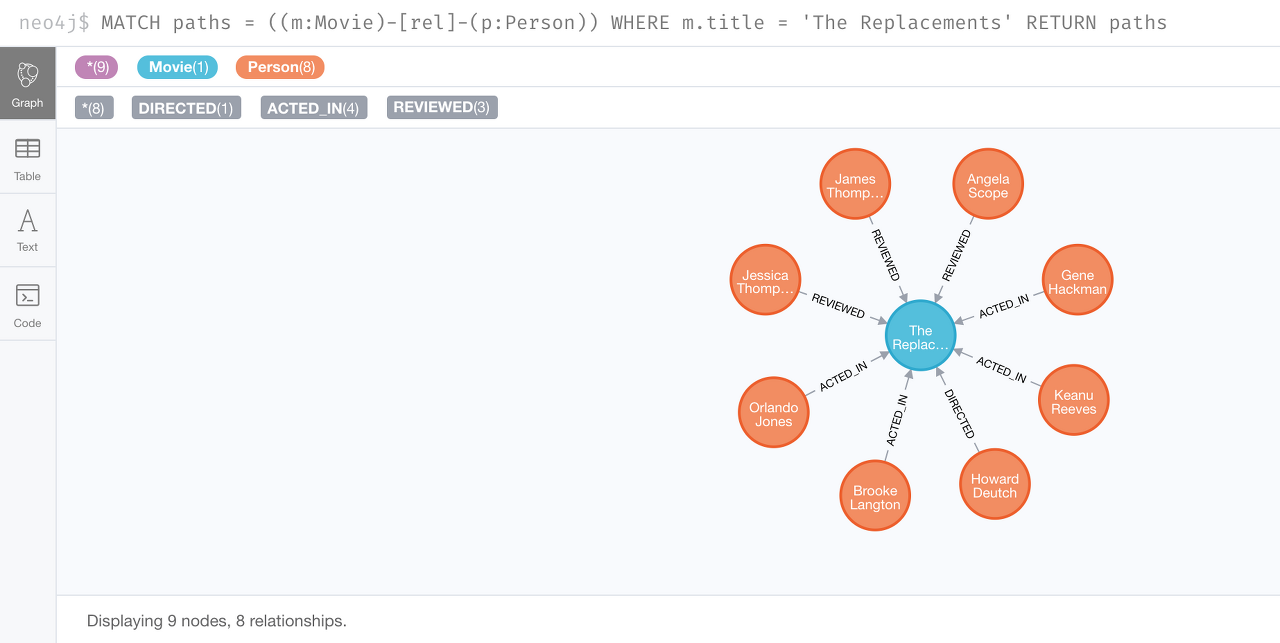 텍스트 뷰로 보면 영화 - ACTED_IN정보- 배우 또는 영화 - REVIEWED- 리뷰어 의 관계로 이루어진 데이터가 나온다.