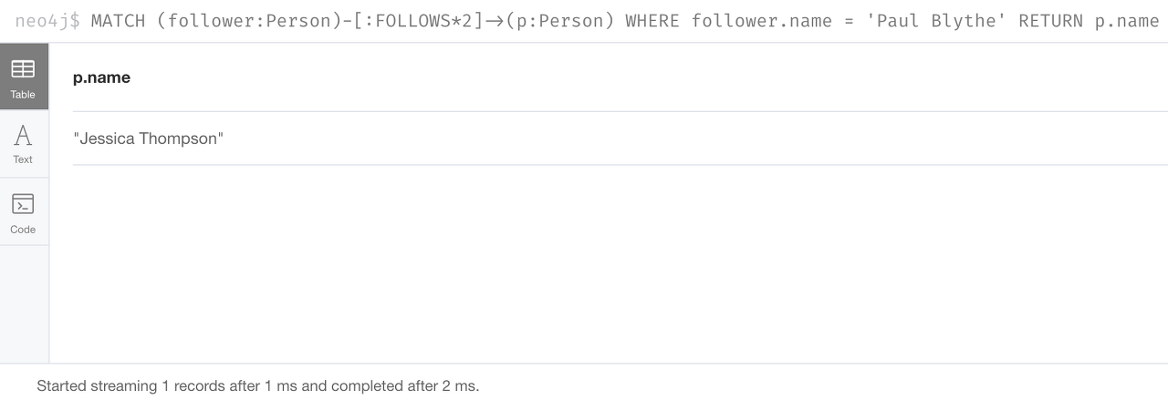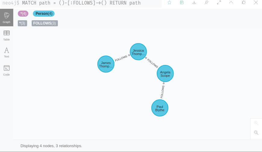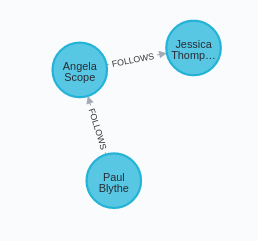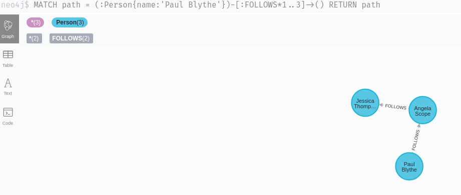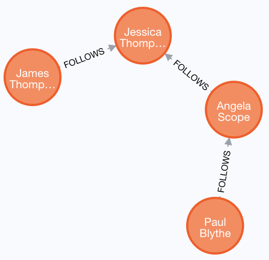 path length는 노드와 노드사이의 hop이라고 생각하면 되겠다. 2촌이라면 length =2 이고 나머지는 각자 대응되는 숫자가 되겠다. 위의 그림에서 Paul Blthe의 팔로잉의 팔로잉을 구하려면 어떻게 해야할까? 전에 다른 예제를 하면서 나왔지만 또 써본다. 우선 생각해 볼 것은 위의 그림을 보면 'Jessica Thopson'이 나온다는것이다.