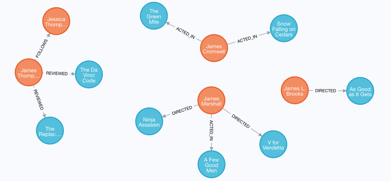 MATCH와 기본적으로 비슷하지만, 질의문에 대한 답이 없으면 Null로 처리하는 것이다. SQL의 LEFT JOIN과 비슷하다고 보면 된다. 예시 데이터는 James라는 이름을 가진 사람들의 subgraph이다