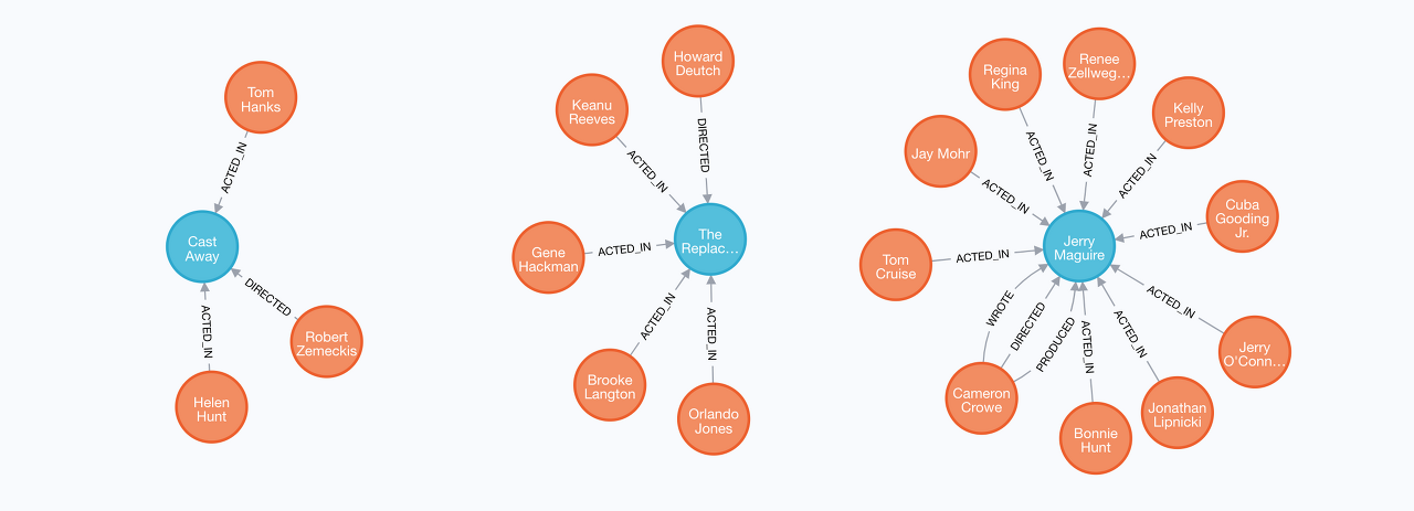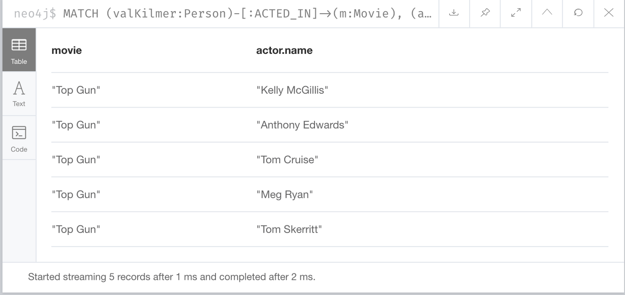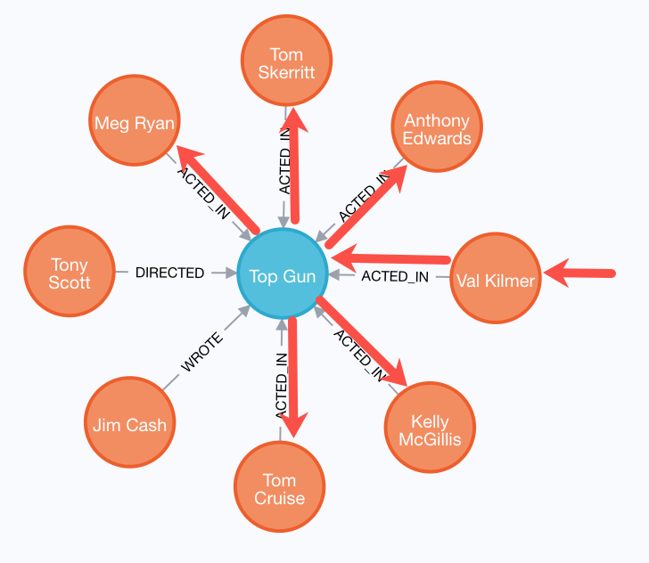 두번째는 탑건을 중심으로 탑건을 연기한 배우들을 찾아내는 것이다. 위에서 주목할 사항은 Val Kilmer에 대한 relationship은 두번 계산되는 것이다.