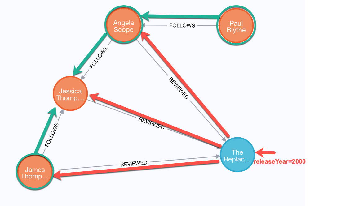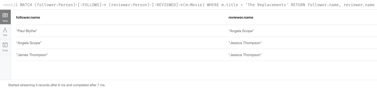 다음과 같은 순서로 그래프 엔진이 작동한다. 우선 영화를 찾는다. 그 후 영화를 리뷰한 사람들을 찾는다. 그런 후 다시 리뷰얼르 팔로우 하는 사람들을 찾는다. 위의 그래프에서 Jessica Thompson은 아무도 팔로우하고 있지 않기 때문에 테이블에 나오지 않는다.