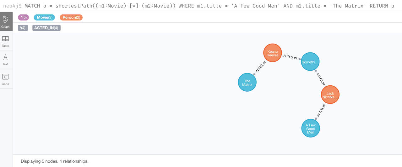 어떠한 두 노드에 대해서 최소의 Hop을 찾는 방법이다. shortestPath()라는 기능을 통해 찾을 수 있다. 여기서는 Matrix와 A Few Good Men 사이의 최소거리를 찾는다.