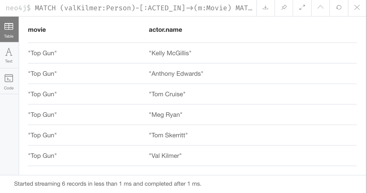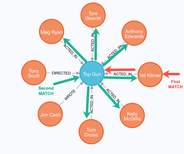 위의 방식을 사용하면 위와 같이 두번 MATCH가 이루어진다. 첫번째는 Val Kilmer노드를 찾아내고, Val Kilmer가 ACTED_IN한 노드를 찾아내는 것이다. 여기에선 Top Gun이다