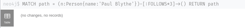 MATCH path = (:Person{name:'Paul Blythe'})-[:FOLLOWS*1..3]->()