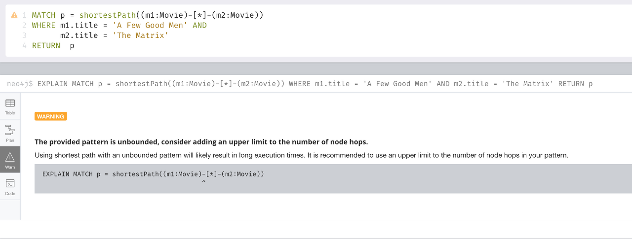 MATCH p = shortestPath((m1:Movie)-[*]-(m2:Movie))