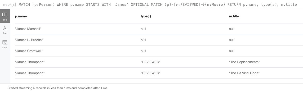해석해보면 이름은 'Jame'로 시작하고, Optional Match로 그 중 영화를 리뷰한 사람을 찾아내는 것이다.