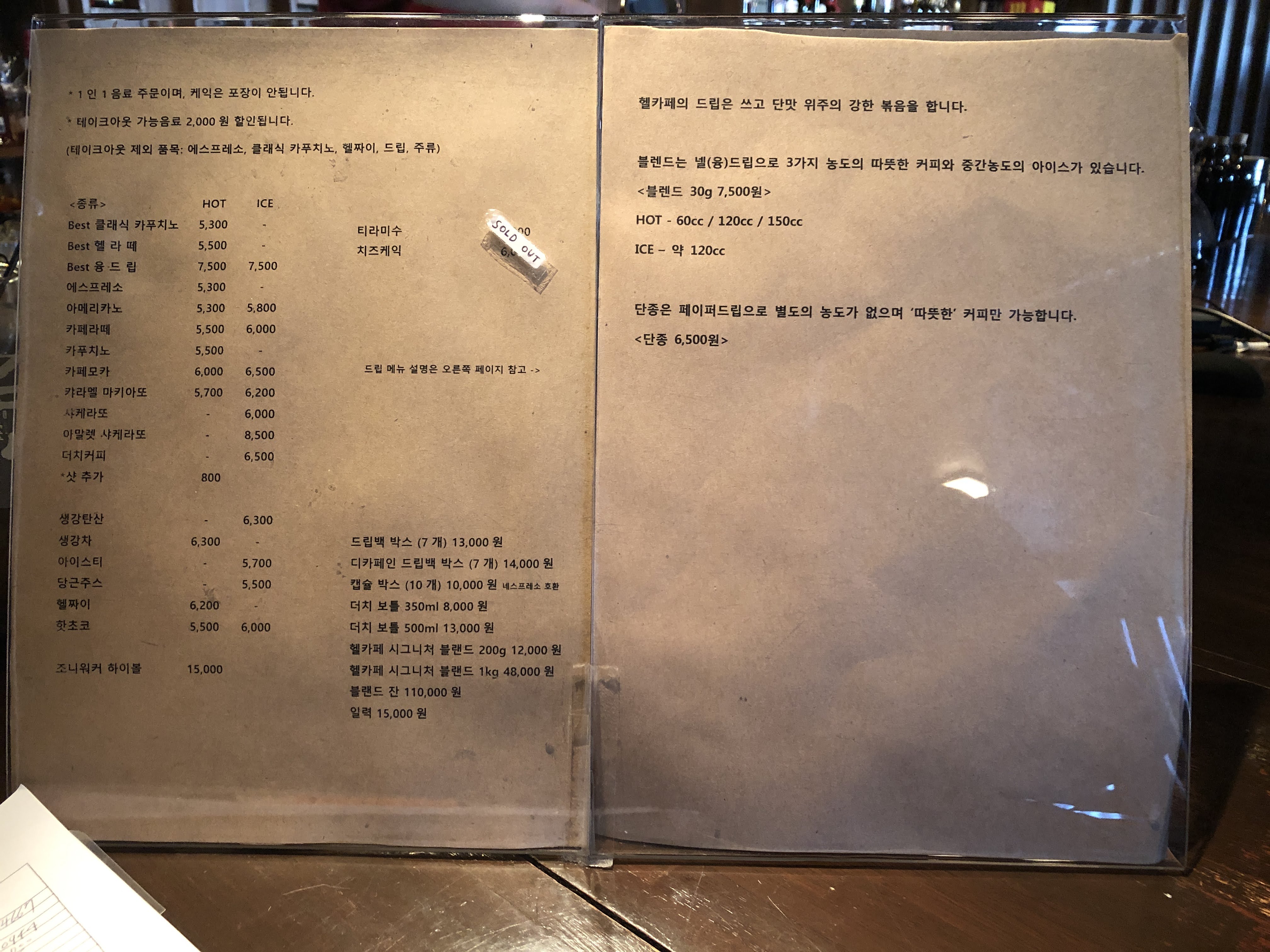 가격대: 커피(5300~7500), 원두 (하단에 사진 첨부)