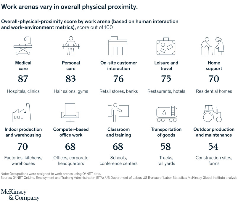 The short- and potential long-term disruptions to these arenas from COVID-19 vary. During the pandemic, the virus most severely disturbed arenas with the highest overall physical proximity scores: medical care, personal care, on-site customer service, and leisure and travel. In the longer term, work arenas with higher physical proximity scores are also likely to be more unsettled, although proximity is not the only explanation. For example: