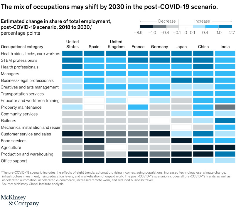 COVID-19로 가속화 된 추세는 전염병 이전에 우리가 추정 한 것보다 경제 내 일자리 혼합에 더 큰 변화를 일으킬 수 있습니다.